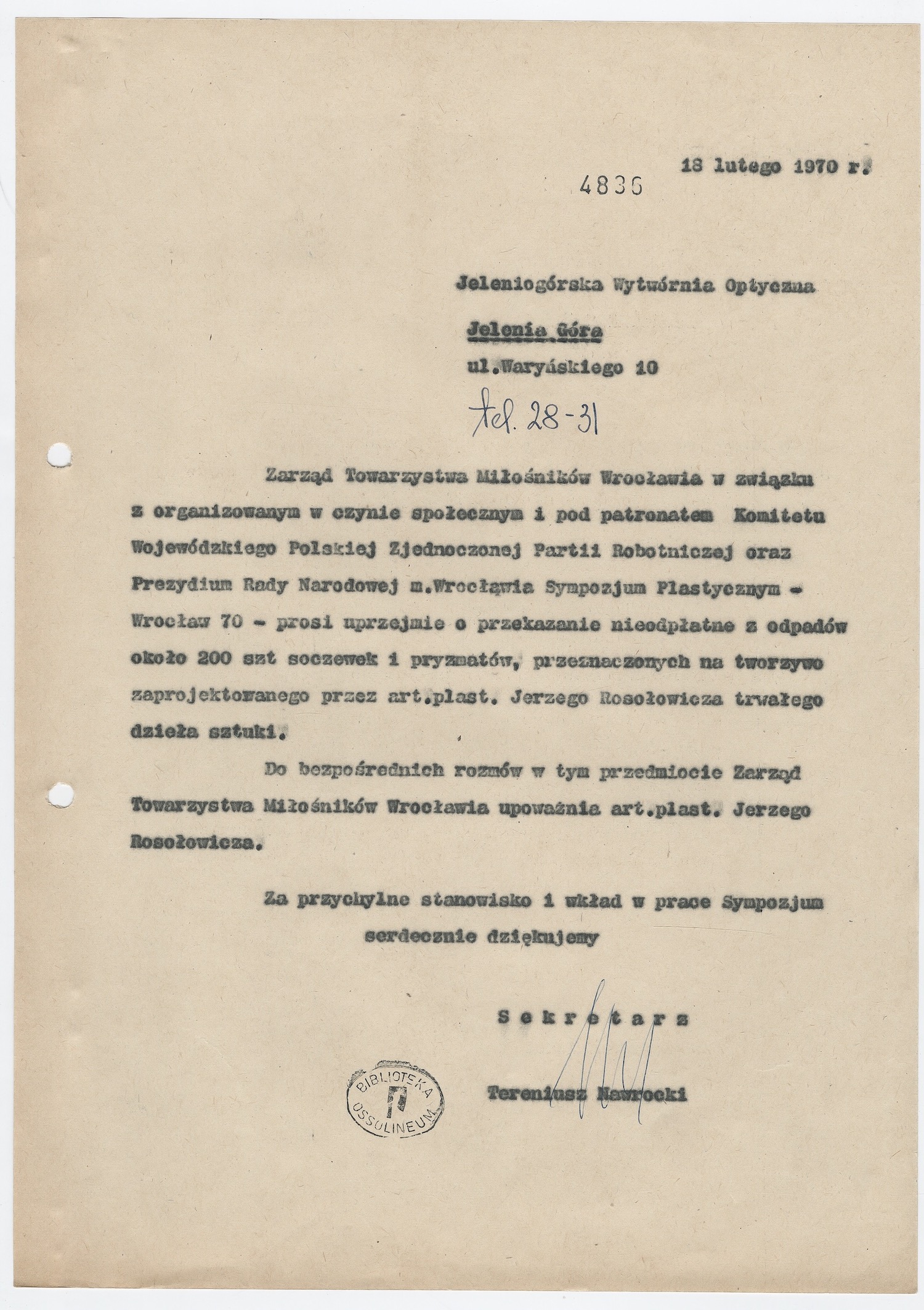 Oficial letter TMW addressed to Jeleniogórska Wytwórnia Optyczna